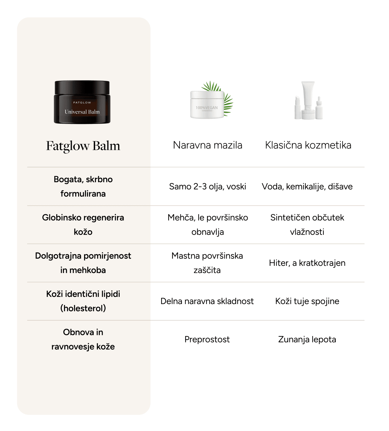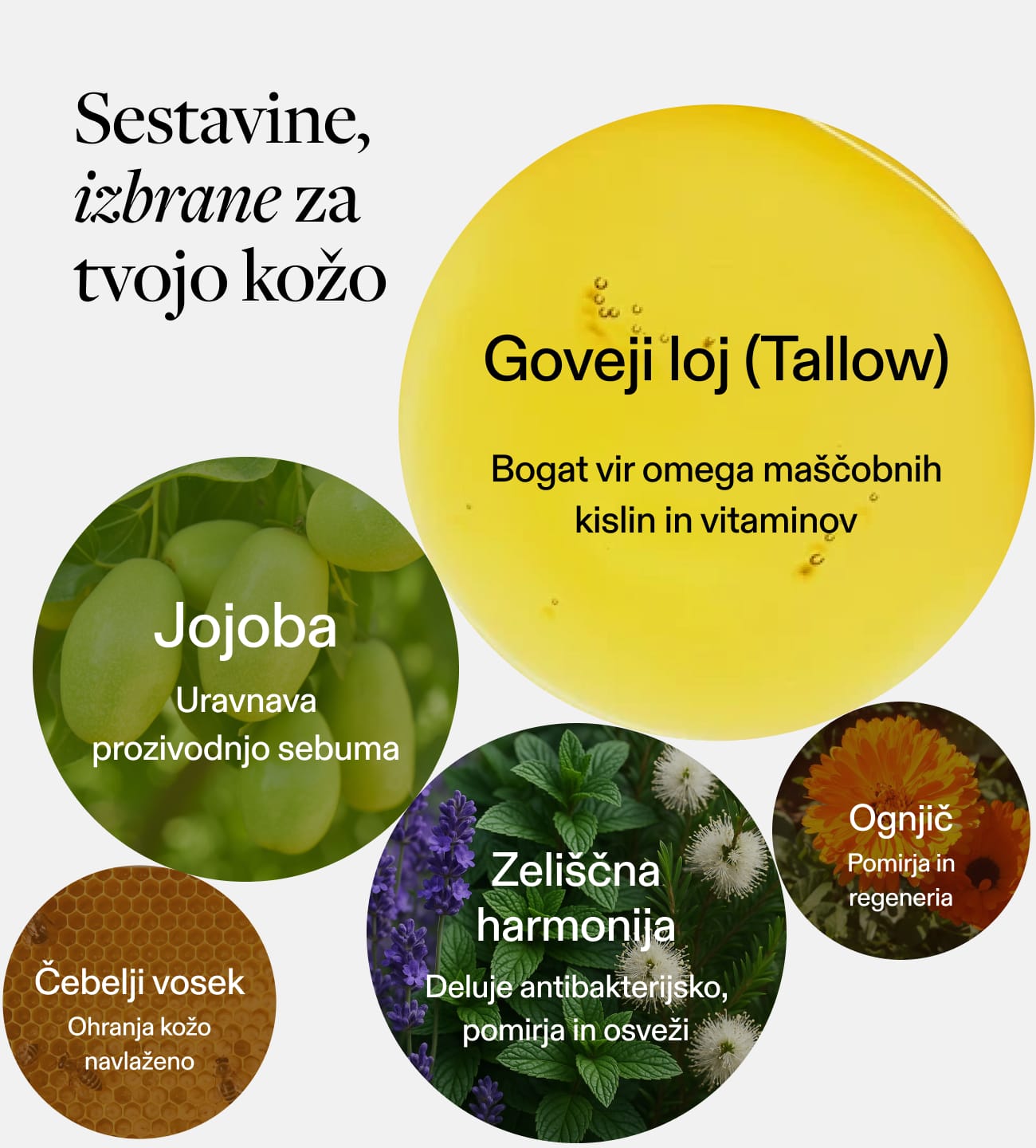Goveji loj obnavlja, mehča in ščiti pred izsušitvijo, hkrati pa podpira naravno ravnovesje kože in njeno bariero.