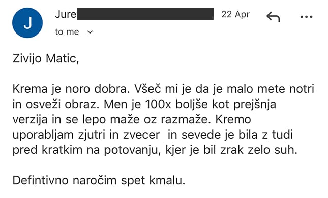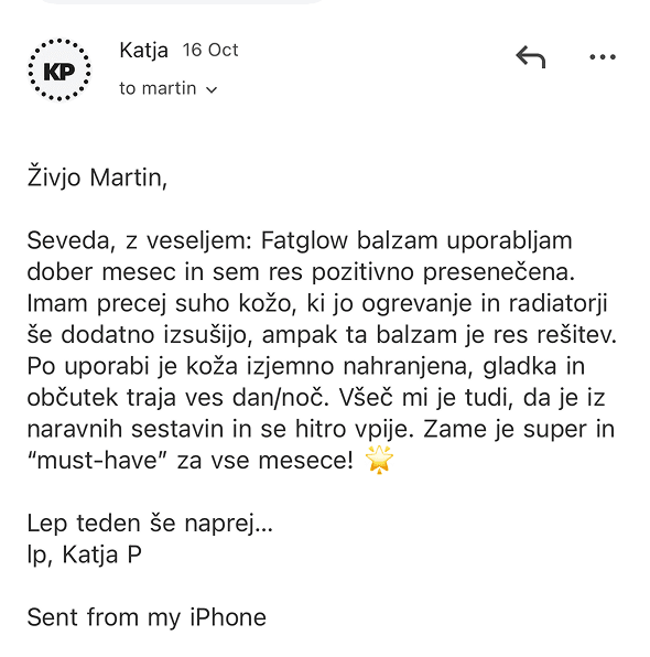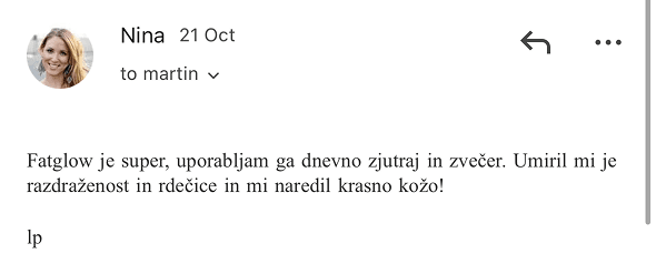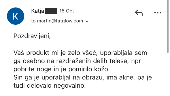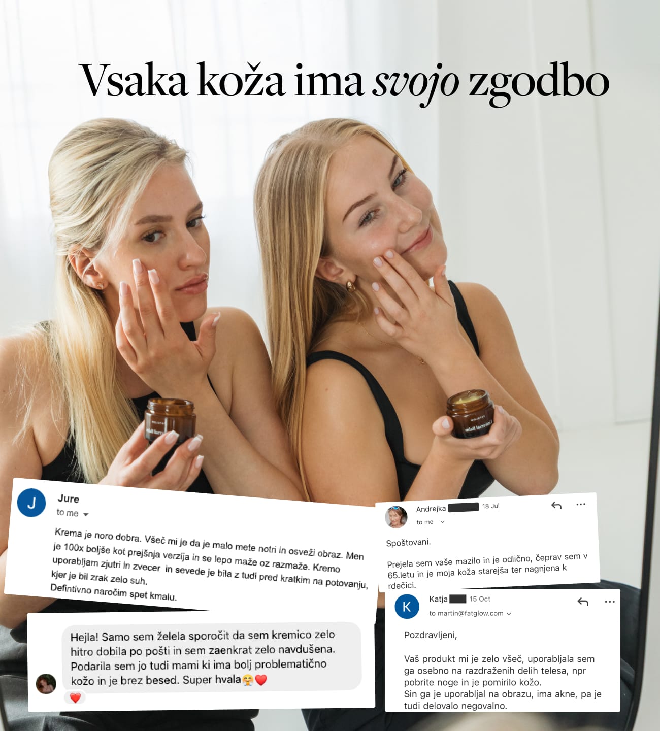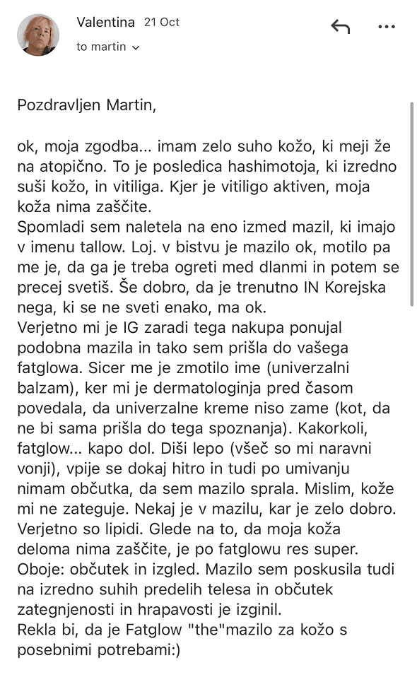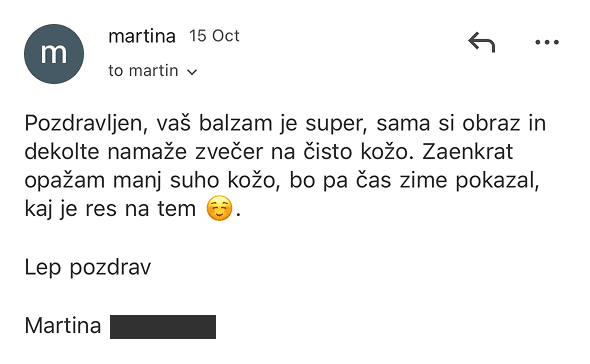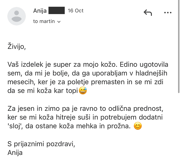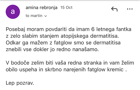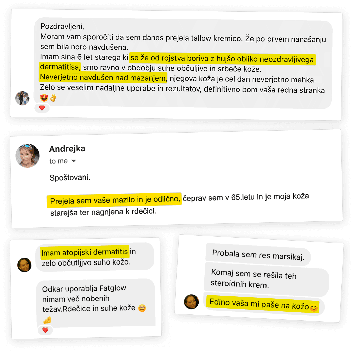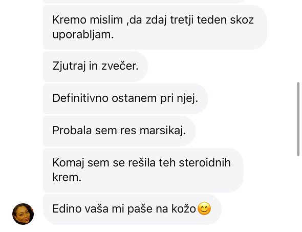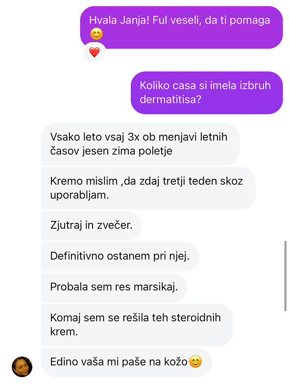 "Končno nekaj kar umirja dermatitis, in moji vrača koži maščobe. Koža ni več suha."